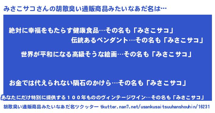 | 男性向けラノベタイトル風あだ名 | 『転生したらみさこサコだった件』 |
