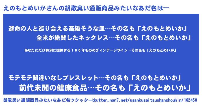 | 意味不明あだ名 | 『住所不定無職えのもとめいか(6歳)』 |
