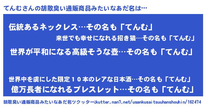 | 男性向けラノベタイトル風あだ名 | 『転生したらてんむだった件』 |