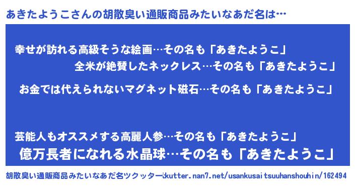 | ヘコむあだ名 | 『なまこ酢』『あきにー』 |