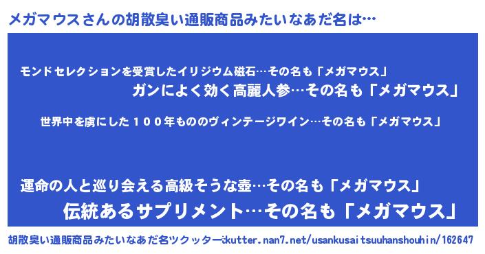 | 意味不明あだ名 | 『住所不定無職メガマウス(1歳)』 |