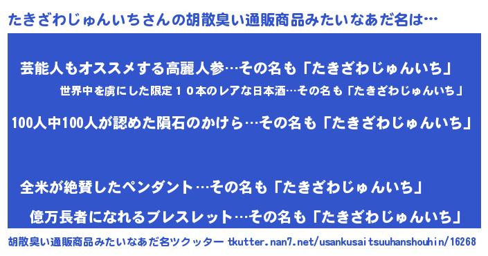 | 男性向けラノベタイトル風あだ名 | 『おまえをオタクにしてやるから、俺をたきざわじゅんいちにしてくれ! 』 |