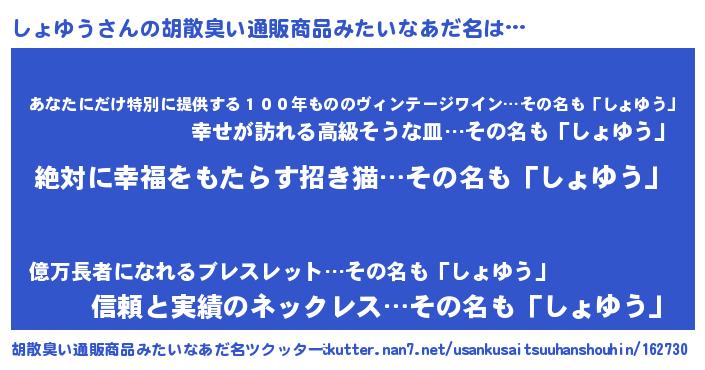 | 男性向けラノベタイトル風あだ名 | 『しょゆうという概念が存在しない退屈な世界 』 |