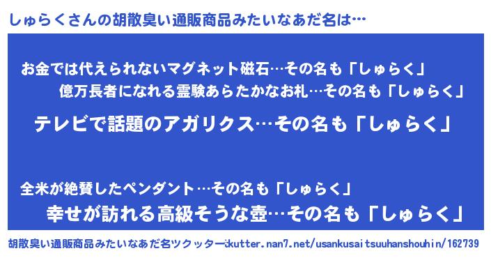 | 料理風あだ名 | 『しゅらくごはん』『しゅらくのトマト煮』 |