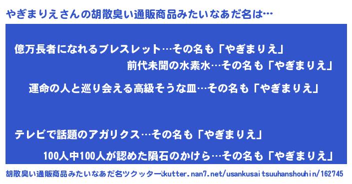 | 男性向けラノベタイトル風あだ名 | 『やぎまりえ~年齢イコール彼女いない歴の魔法使い~』 |