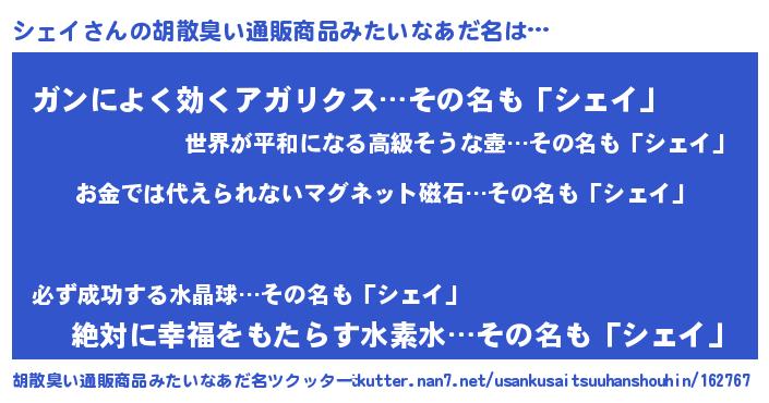 | ヘコむあだ名 | 『シェイ(小並感)』『なまこ酢』 |
