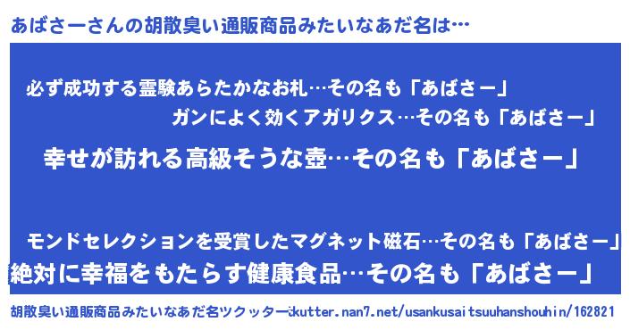 | 男性向けラノベタイトル風あだ名 | 『アバサースレイヤー』『あばさーの憂鬱』 |