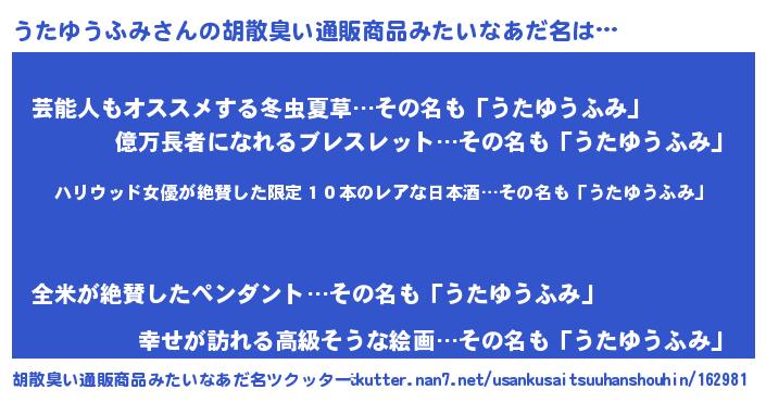 | 意味不明あだ名 | 『住所不定無職うたゆうふみ(47歳)』 |