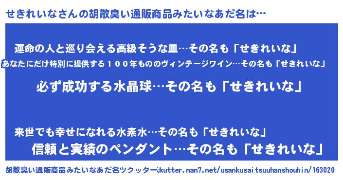 | 恥ずかしいあだ名 | 『プリティーせきれいな』『せきっちょ』 |