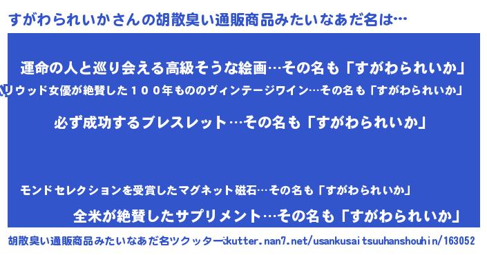 | 男性向けラノベタイトル風あだ名 | 『すがわられいかの憂鬱』 |