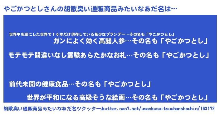 | 伝説のあだ名 | 『不死鳥のスナイパーやごかつとし』 |