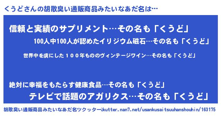 | 意味不明あだ名 | 『住所不定無職くうど(5歳)』『自称くうど』 |