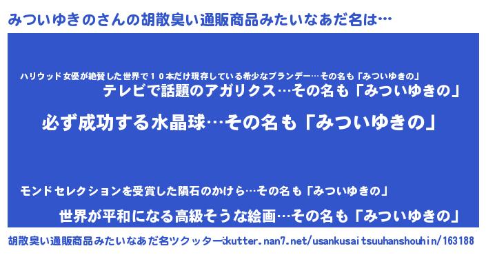 | 女子向けラノベタイトル風あだ名 | 『(仮)みついゆきののやんごとなき事情』 |