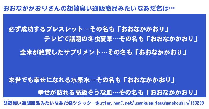 | 男性向けラノベタイトル風あだ名 | 『おおなかかおり~年齢イコール彼女いない歴の魔法使い~』 |