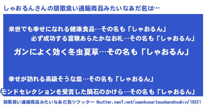 | 意味不明あだ名 | 『自称しゃおるん』『永久保存しゃおるん』 |
