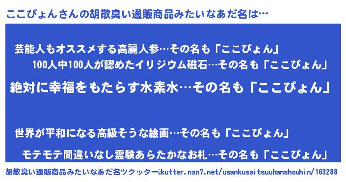 | 男性向けラノベタイトル風あだ名 | 『ここぴょんという概念が存在しない退屈な世界 』 |