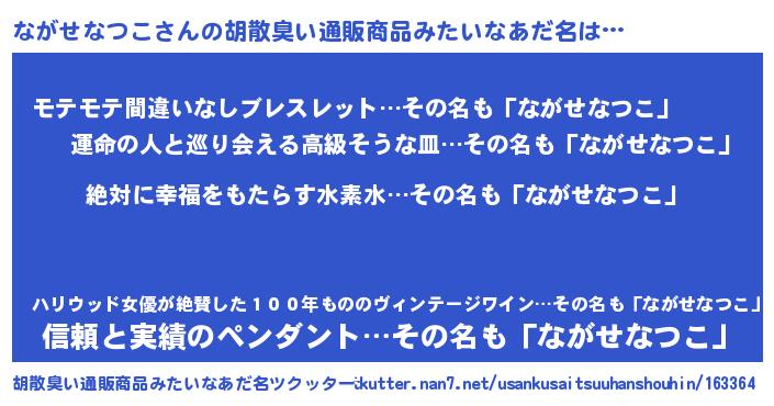 | 女子向けラノベタイトル風あだ名 | 『異世界で失敗しない100のながせなつこ』 |