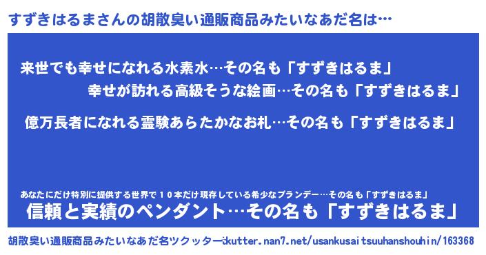 | ヘコむあだ名 | 『すずっふぃ~』『すずきはるま(震え声)』 |