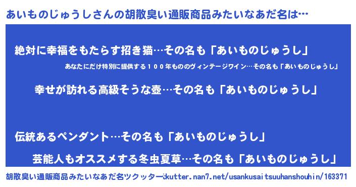 | 女子向けラノベタイトル風あだ名 | 『あいものじゅうしの雑貨屋さん』 |