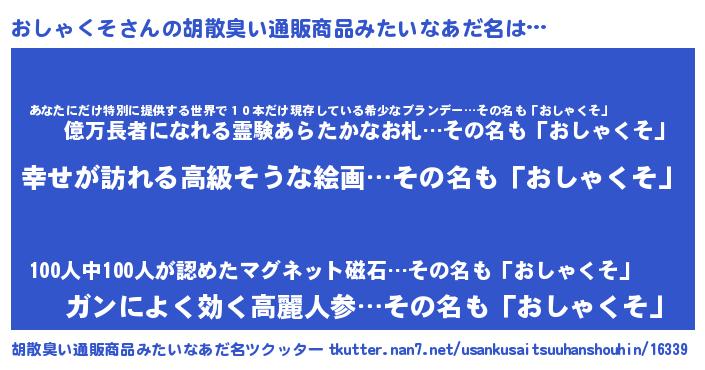 | 男性向けラノベタイトル風あだ名 | 『やはりおしゃくその青春ラブコメはまちがっている 』 |