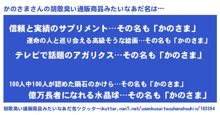 | 意味不明あだ名 | 『自称かのさま』『ペロリンかのさま』 |