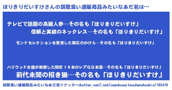 | 男性向けラノベタイトル風あだ名 | 『ノーゲーム・ノーホリキリダイスケ』 |