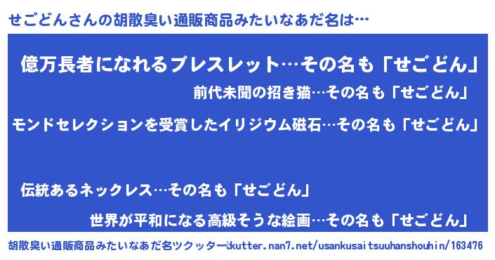 | ヒーロー風カッコイイあだ名 | 『天空の使者せごどん』『ネオセゴドン』 |