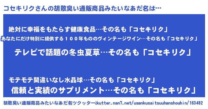 | 男性向けラノベタイトル風あだ名 | 『Re:コセキリクから始める異世界生活』 |