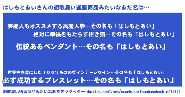 | 男性向けラノベタイトル風あだ名 | 『はしもとあいの嫁は女の子じゃないと思った?』 |