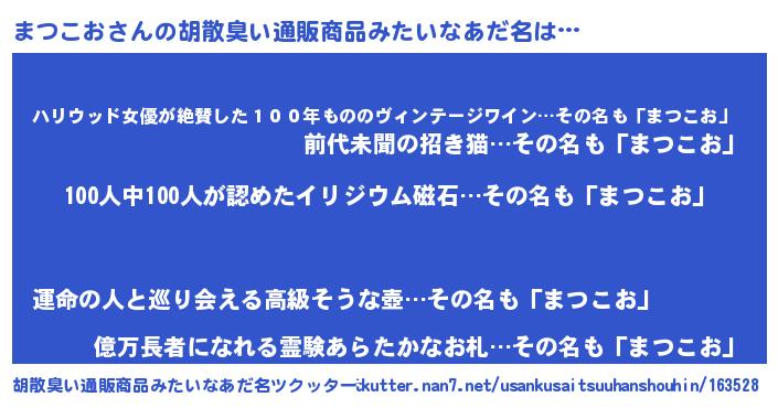 | ヘコむあだ名 | 『まつにゅー』『まつこお(小並感)』 |