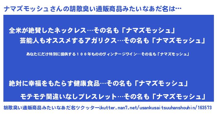| 意味不明あだ名 | 『住所不定無職ナマズモッシュ(1歳)』 |