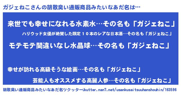 | 男性向けラノベタイトル風あだ名 | 『ガジェねこの憂鬱』『緋弾のガジェネコ』 |