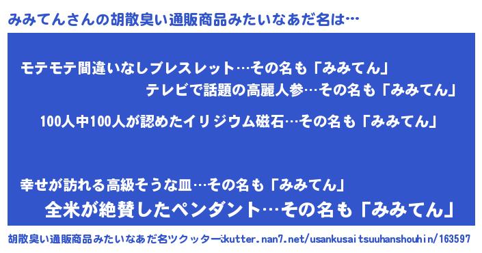 | 意味不明あだ名 | 『めかぶ科みみてん属』『自称みみてん』 |