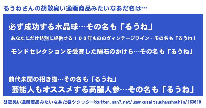 | 欧米人風あだ名 | 『アンジェラ・るうね』『ダニエルるうね』 |