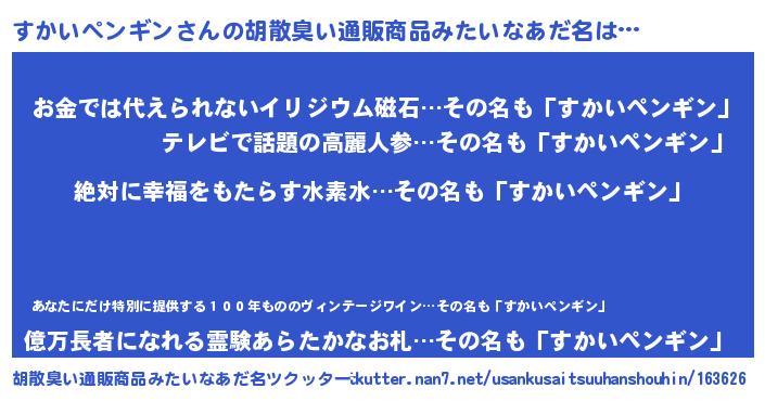 | 男性向けラノベタイトル風あだ名 | 『すかいペンギンという概念が存在しない退屈な世界 』 |
