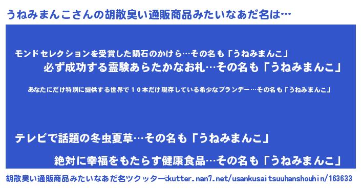 | 意味不明あだ名 | 『住所不定無職うねみまんこ(84歳)』 |