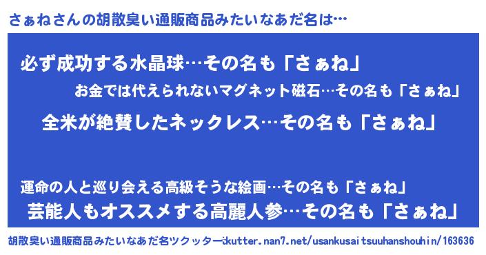 | ヘコむあだ名 | 『さぁっ子』『さぁにー』『なまこ酢』 |