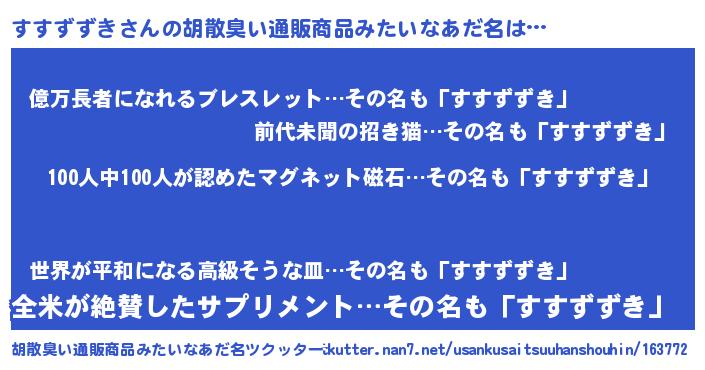 | ヒーロー風カッコイイあだ名 | 『正義の使者すすずずき』『天弓騎士スス』 |