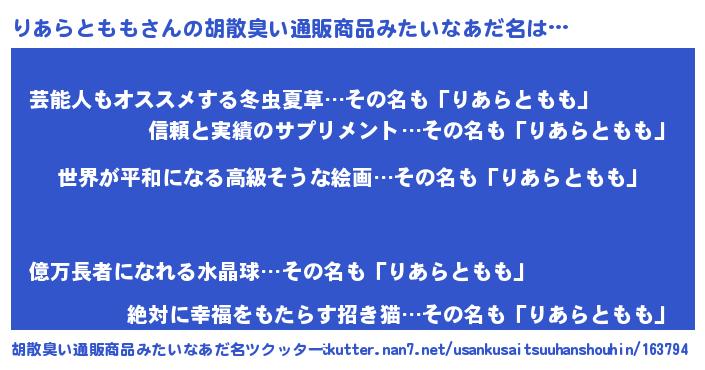 | ヘコむあだ名 | 『豆乳』『りあらともも(遠い目)』 |
