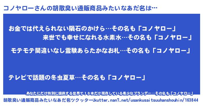 | 男性向けラノベタイトル風あだ名 | 『転生したらコノヤローだった件』 |