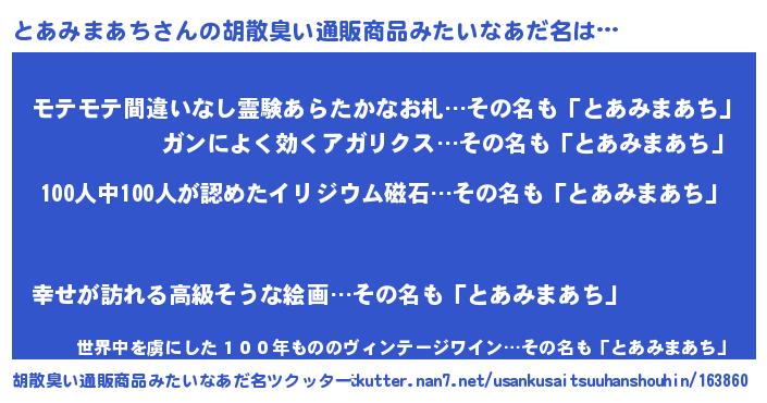 | 男性向けラノベタイトル風あだ名 | 『おまえをオタクにしてやるから、俺をとあみまあちにしてくれ! 』 |