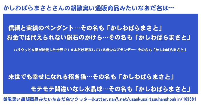 | 伝説のあだ名 | 『孤高の遊び人かしわばらまさと』 |