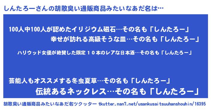 | 意味不明あだ名 | 『住所不定無職しんたろー(14歳)』 |