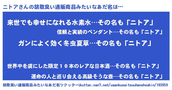| 意味不明あだ名 | 『自称ニトア』『永久保存ニトア』 |