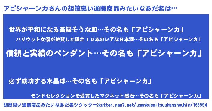 | ポケモン風あだ名 | 『ヒアピシャーンカ』『アピシダネ』 |