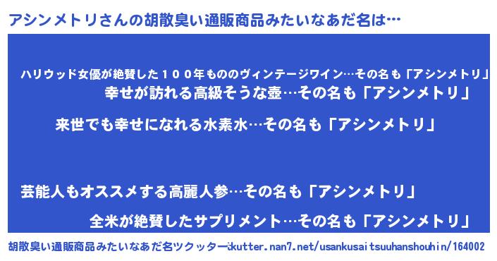 | 意味不明あだ名 | 『永久保存アシンメトリ』 |