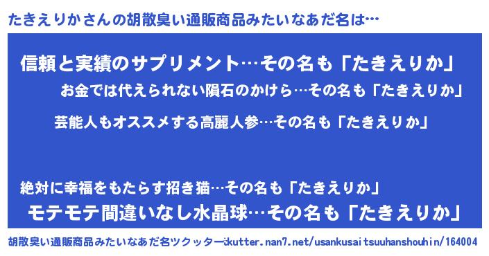 | 恥ずかしいあだ名 | 『タキエリカデラックス』『タキリンリン』 |