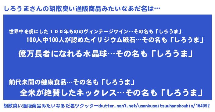 | 意味不明あだ名 | 『ペロリンしろうま』『永久保存しろうま』 |
