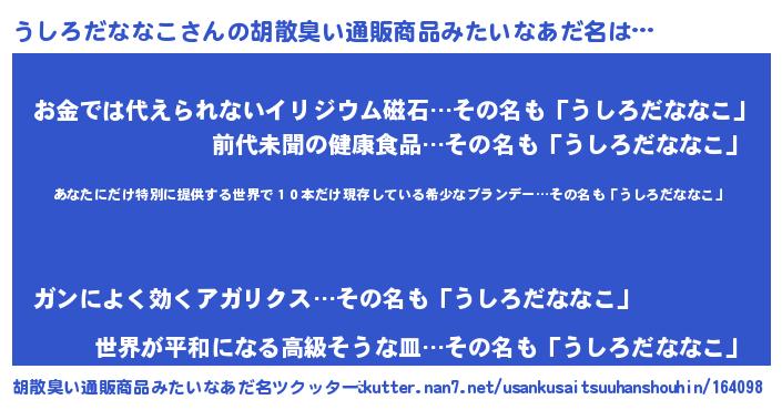| 意味不明あだ名 | 『住所不定無職うしろだななこ(89歳)』 |