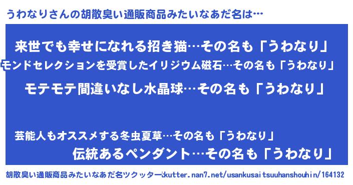 | 男性向けラノベタイトル風あだ名 | 『転生したらうわなりだった件』 |